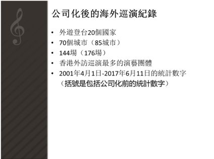 上述统计数字中公司化前后海外巡演记录大幅度的比例变化,即为香港中乐团立志迈向“香港人引以为荣的世界级乐团”的成绩。