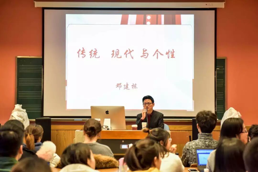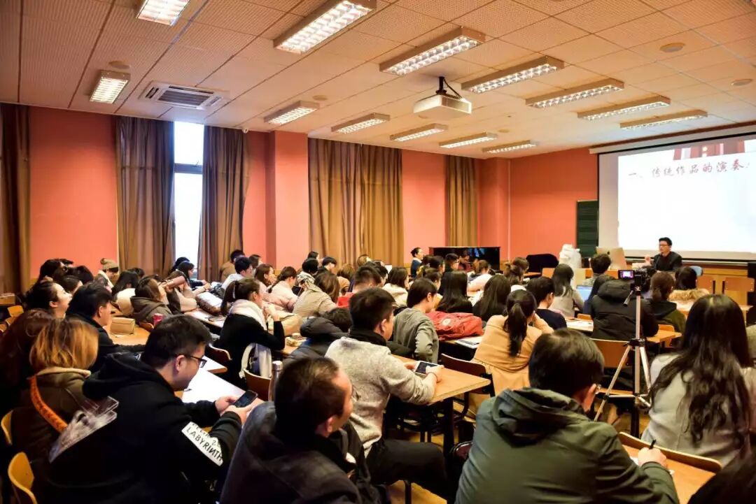 通过邓建栋个人曾经从事戏曲音乐和民间音乐学习工作的经历,他认为浸染在民族民间音乐中的这种学习经历,对音乐创作与演绎有着十分重要的意义,而且这种戏曲和民间音乐的学习是融进血液中的。由此可见,要掌握好传统作品的演奏,需要我们深入学习戏曲音乐、说唱音乐和各地方的民间音乐。并现场演奏一段锡剧及沪剧《紫竹调》,他精湛的演奏赢得同学们的阵阵掌声。