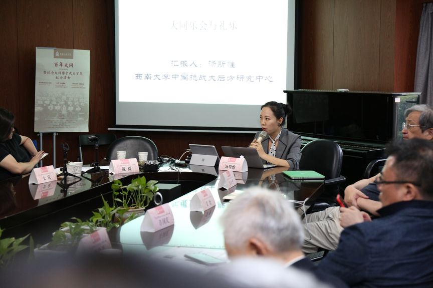 第三位发言者,来自西南大学中国抗战大后方研究中心、西南大学教育学部的汤斯惟老师发表了以《抗战时期大同乐会与礼乐》为题的论文宣讲。1943年,国立礼乐馆在重庆成立。汤老师主要论述了抗战时期大同乐会在重庆的发展概况,包含了乐器的制作情况、教材的编写与演出、为国民政府创作能代表国家意识形态的“国乐”、以及其对上海大同乐会同胞的援助。