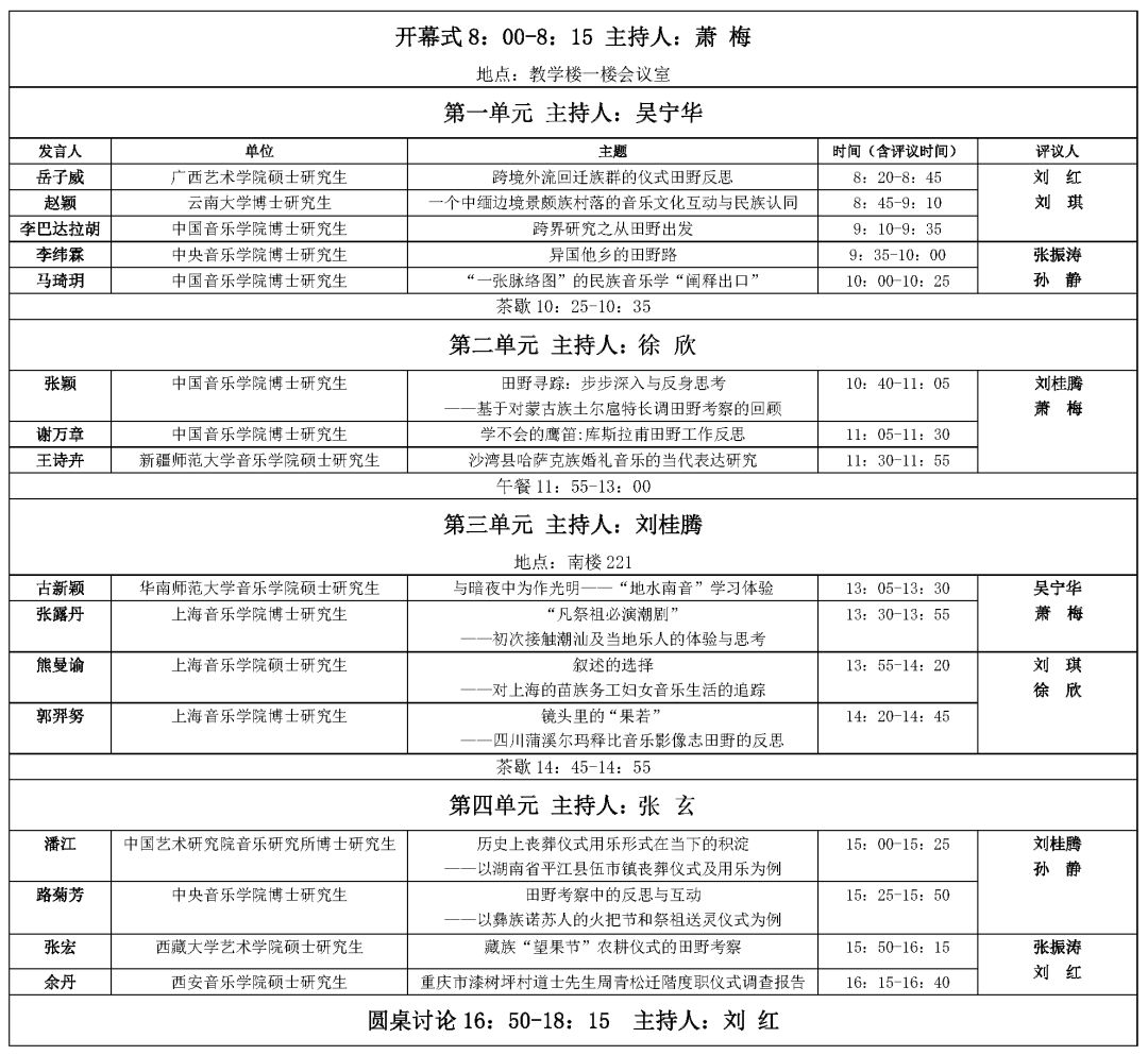 本次论坛将于2019年5月5日(周日)在上海音乐学院教学楼会议室/南楼221召开,有来自中央音乐学院、中国音乐学院、中国艺术研究院、西安音乐学院、新疆师范大学音乐学院、广西艺术学院、云南大学、华南师范大学音乐学院、西藏大学艺术学院、上海音乐学院等各高校音乐学专业的硕士、博士16人,并邀请中国艺术研究院音乐研究所研究员、南京艺术学院音乐学院特聘教授张振涛,上海音乐学院“中国生态音乐学”团队特聘教授刘桂腾,广西艺术学院吴宁华教授,北京大学人类学博士、现任华东师范大学人类学研究所副研究员刘琪,上海音乐学院“中国仪式音乐研究中心”主任萧梅教授,民族音乐系系主任刘红教授,音乐研究所徐欣副教授、音乐学系讲师张玄博士以及北京大学社会学系人类学专业博士候选人、“鹦歌山居”读书会主持人之一的孙静担任评议和主持。