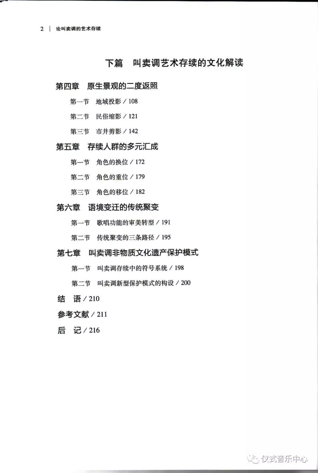 《论叫卖调的艺术存续》是上海音乐学院教师张玄博士的毕业论文。这篇论文有几个特点:一是采用了实证研究方法,下功夫筛选一首首代表性的叫卖调,通过解剖麻雀的方式,去发现每首歌在体裁、题材、旋律构成、歌词、演唱等各要素中有关风土的蛛丝马迹,继而追根寻源、层层剥离出其所含的地理、民俗、信仰、观念等丰富的信息量,依靠《中国民间歌曲集成》《中国曲艺音乐集成》《中国戏曲音乐集成》各省、市、自治区卷这巨大的宝库和资源,在浩瀚的《集成》曲目中反复查找、精心挑选典型案例,并关联不同体裁的同源关系,有针对性地进行分析;二是做了扎实的实地采风,在其教学工作之余,踏歌寻典,到北京、天津、山西、河南等多地采风,探寻叫卖调存续的现状,探访老专家、老艺人、老商家、上年纪的市民,以求在文章中“复活”叫卖调曾赖以生存的文化生态;三是扩展视野,对于叫卖调的音乐体裁沿革、艺术形态更迭做贯穿性的思考,对于叫卖调的艺术存续提出了七点理论总结,并在文末提出了自己的方案和创想;四是框架新颖,上篇谈音乐路径、下篇为文化解读,由音乐表象深入至文化机理,层层剥茧,以现叫卖调艺术存续全貌。