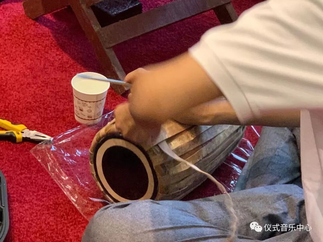 乐器调律于讲座前一天即2019年11月26日下午13点开始。调律工作由Htet Arkar先生负责,调律的乐器先后包括围鼓、围锣、炬锣等缅甸传统打击乐队所用乐器。传统的缅甸打击乐器是带有音高属性的,因此这种独特的打击乐也使用独特的调律方式。