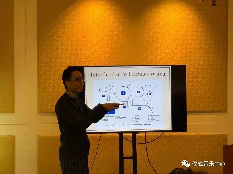 会上Htet Arkar先生对缅甸的传统打击乐队(Hsaing Waing)又称围鼓乐队进行介绍。Htet Arkar先生向听众们介绍了个人演奏经历、传统器乐发展历史、乐器组成、调式调性、音乐风格等方面的介绍,还播放大量音频文件使听众深刻了解缅甸传统打击乐队。