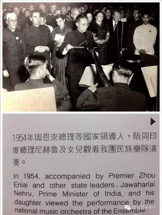 周恩来总理陪同印度总理尼赫鲁观看中央歌舞团演出,陈天乐演奏琵琶。