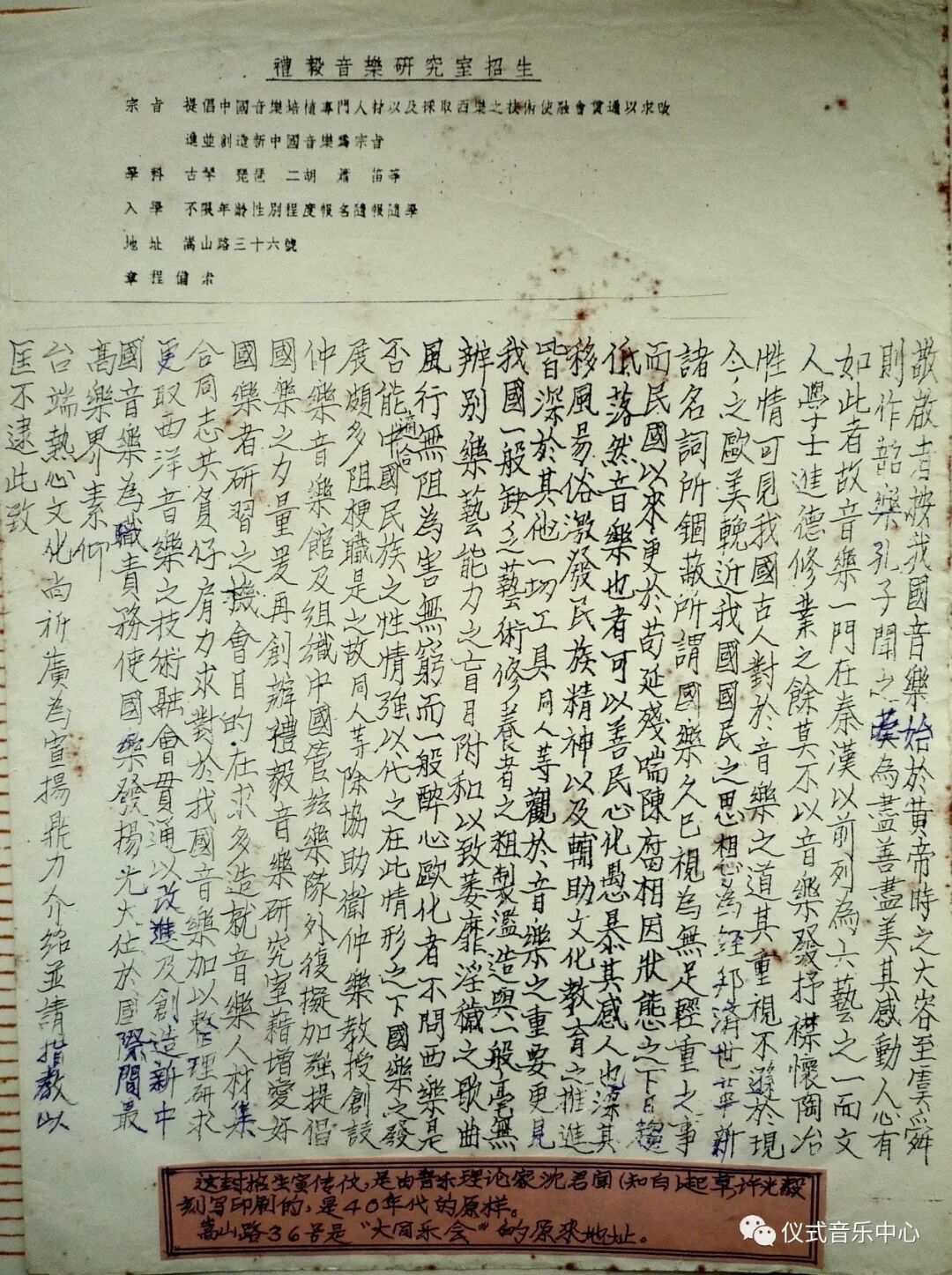 金祖礼、许光毅40年初在大同乐会门口的招生贴(沈知白起草、许光毅刻印)