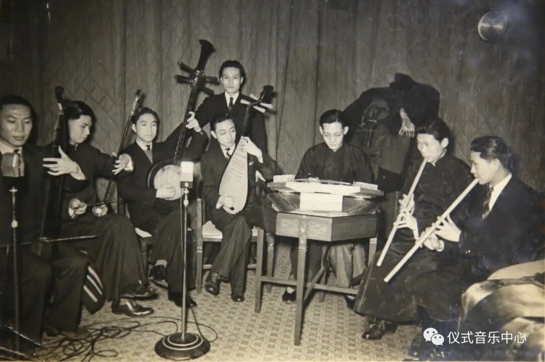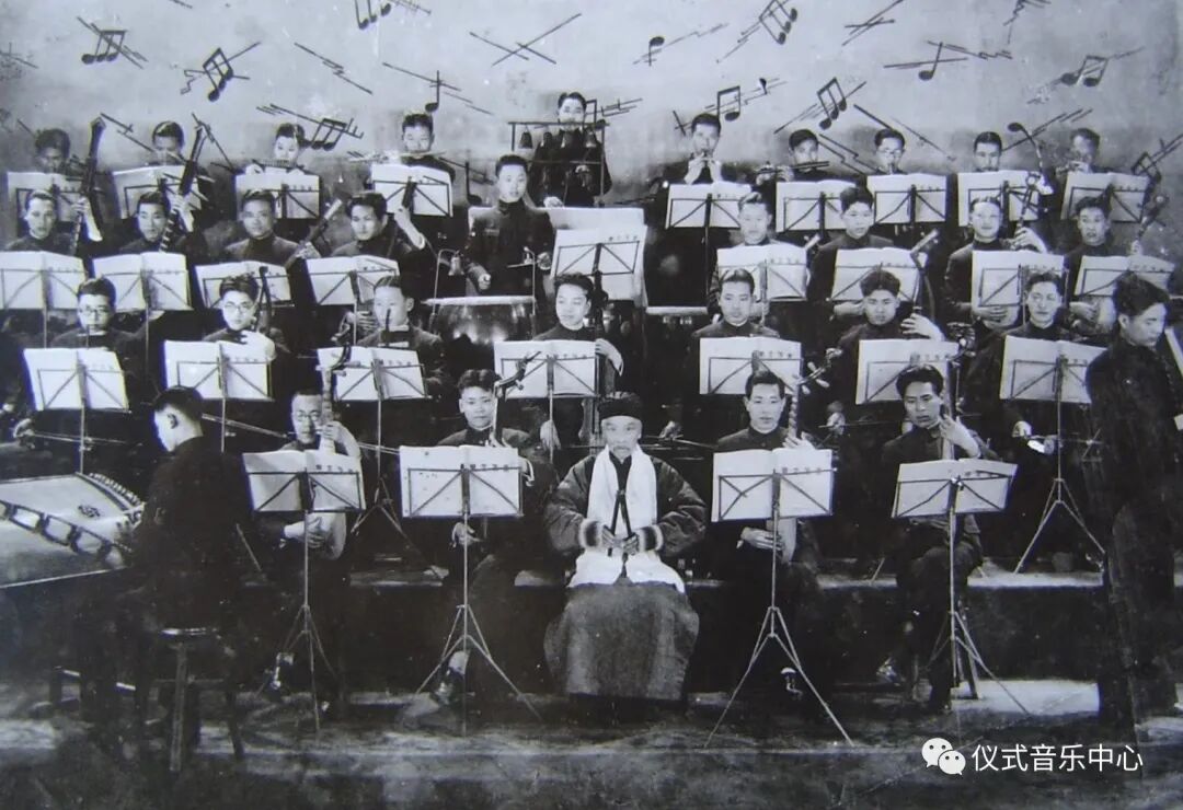 中座执板者为郑觐文,左边鼓瑟者为罗松泉,右边奏七十二弦箜篌者为陈启凡。
