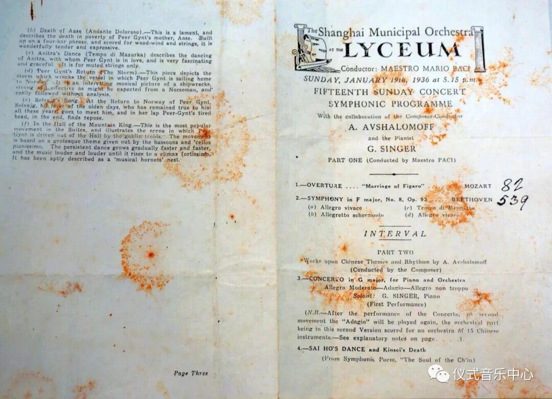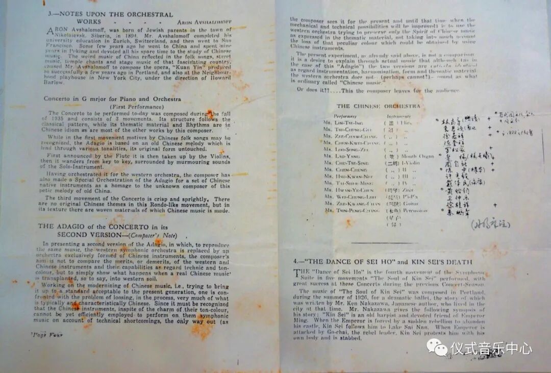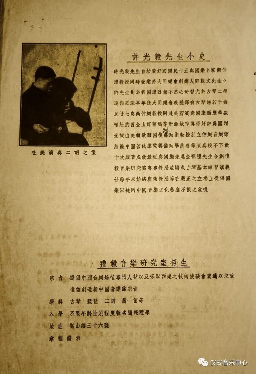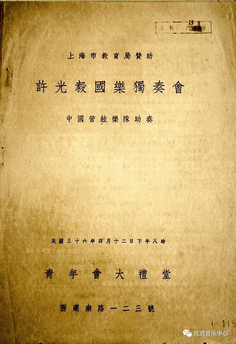 说明:1936年1月19日于上海兰心大戏院,由卫仲乐、秦鹏章、许光毅等人组成民族乐队与钢琴家辛格一起合作演奏由俄国作曲家阿龙·阿甫夏洛穆夫创作的钢琴与民族乐队合奏曲《忆王孙》。