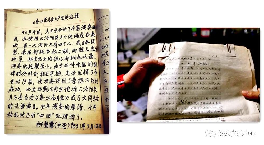 说明:柳尧章回忆《春江花月夜》的手稿(左)及陈正生采访柳尧章的记录(右)