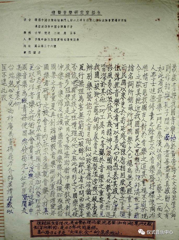 40年代初,金祖礼、许光毅在大同乐会门口的招生贴(沈知白起草、许光毅刻印)