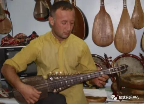 图4:乌兹别克制琴师和奥塔别克在布哈拉(Bukhara)演奏阿富汗鲁巴布;桑木制的弹布尔和都塔尔挂在其身后,作者摄)
