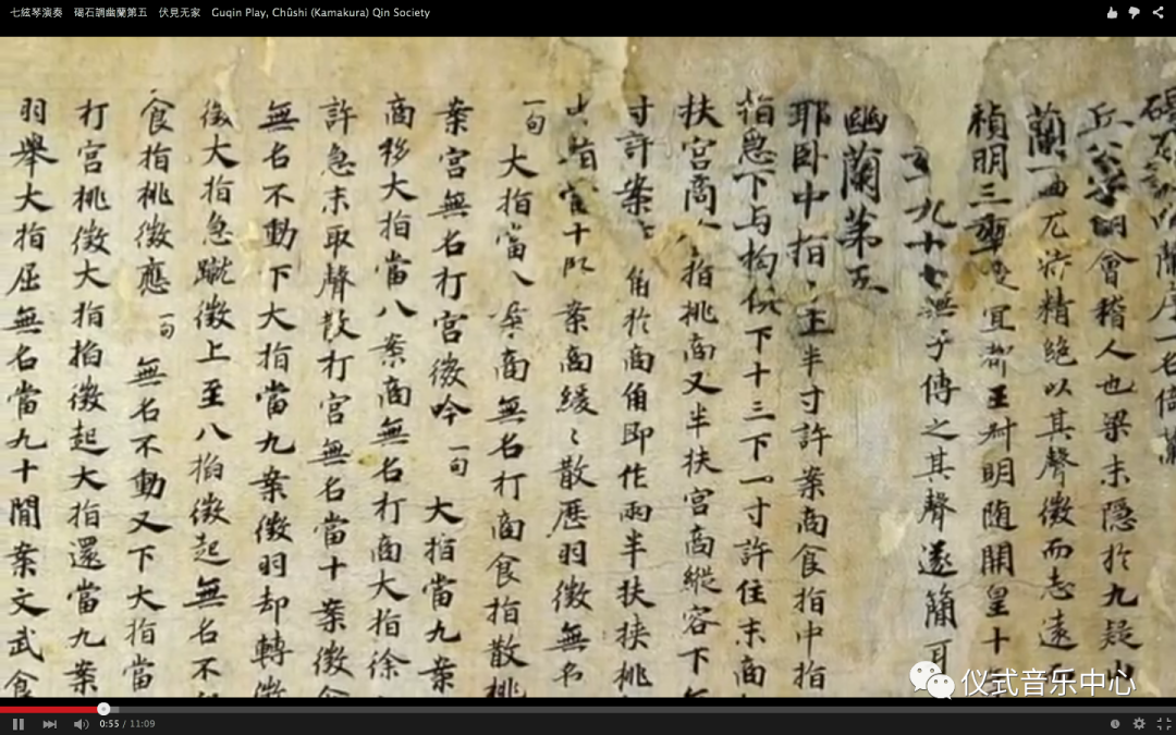 【注:该谱完全是文字为媒介的叙述体,来整体转换聽觉知识和场景。图片取自Youtube视频分享网站,有关《碣石调·幽兰》的视聽对照纪录片;Youtube虽然是个视觉网站,但是从名字上就可以看出其声音特征,它更像一个数位时代的声音巴别塔,Youtube实际是Youtower。】