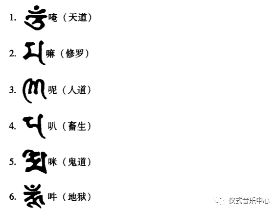 在这方面,我们可以看到佛教经咒中对声音大量使用的例子,尤其是从六字真言当中,我们几乎可以把它视为一种全息型、胚胎学和聽觉型知识。如下文对梵文的翻译,将其释义为完全纯然的聽觉符号,但是奇怪的是所有的字型翻译中,左边有一个“口”字。这个口字,仅仅标示这是通过一个发声的符号和孔洞所传达的宇宙?还是一个被人器官中介化的自然本体声响?