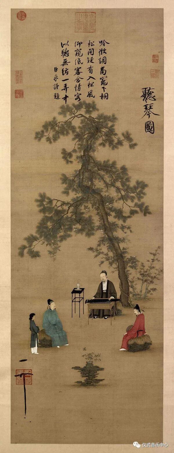 最后让笔者介绍另一个著名的聽觉场景——《听琴图》,题款中蔡京讲徽宗皇帝高妙的琴艺,其中提到“似聽無絃”这个词汇: