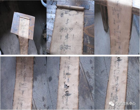 仪式法器:“得祥”[dəɕiaŋ214],即香;“嘎瑙卜鬼”[ga nɔ21 phu53 kwi35],即剪切有圆孔和月牙的黄色冥纸;“尼得”[ni35 te35],即用于灵魂鬼师附体的红布;“阿篰”[ə bu55],即卜卦用的两块竹条。