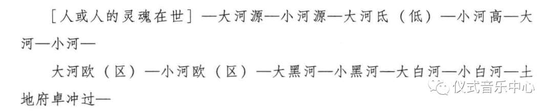在这些大、小河流流域,就是所有“鬼丧”聚居的地方,而“过河声”的节奏型就是对这些河流波荡律动的表达。另外,在巴哼文化信仰世界的图式中,若干条灵魂之河均处于混乱状态的边地。根据鬼师“送鬼过河”一说中,“过河的灵魂就能和现世世界一样,可以买地买田、娶妻生子”来分析,灵魂之河的对岸就是“来生”——一个和现在一样的世界。在巴哼文化的传统观念里,“来生”的说法会经常存在于真实的故事中。2010年暑期在城卡屯进行调查期间,当地巴哼人就讲述了一个关于“来生”的真实故事: