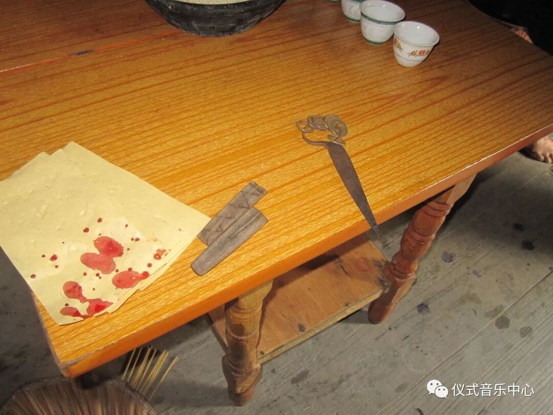 仪式法器:“得祥”,即香;“嘎瑙卜鬼”[ga nɔ21 phu53 kwi35],即剪切有圆孔和月牙的黄色冥纸;“阿篰”[əbu55],即卜卦用的两块竹条;“啼啕”[thi55 thɔ55], 即与鬼丧搏斗的金刀法器,也是可以使鬼师进入癫狂状态的响器。