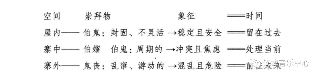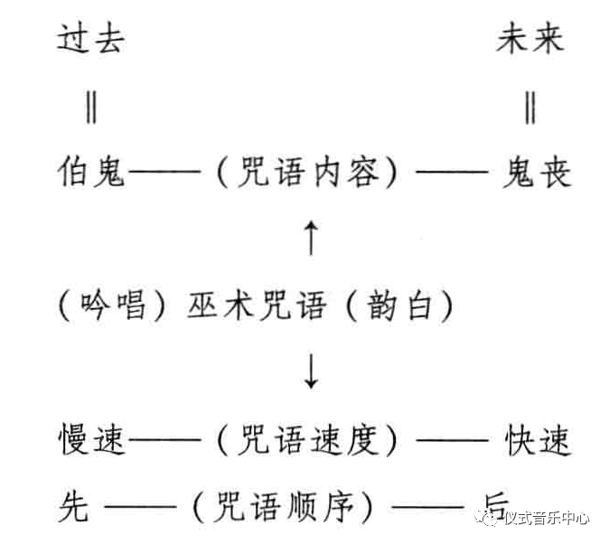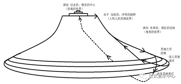 综上所述,“卜鬼”和“医鬼”巫术仪式的声音呈现着巴哼文化信仰体系所含的象征意义,并展示着巴哼文化的信仰世界。即,巴哼文化的信仰世界是由一个源自过去的稳定中心和一个向未来扩散的混乱边缘构成的世界,在这个世界中,过去源源不断地诞生自稳定的中心,而当前则处于两种状态之间,并不断涌向未来的混乱边缘。