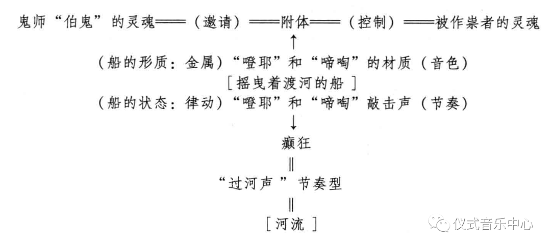 该节奏型是一种“过河声”,阴鬼师只有处于“过河”的状态时,身体才会出现明显的、没有左右摇摆,只有上下晃动的癫狂特征,以示对乘船过河时身体所强烈感受到的“颠簸与起伏”的象征。