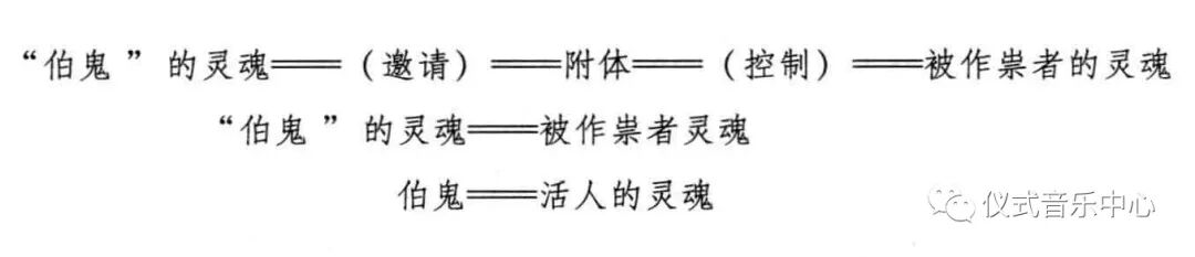 通过对“噔耶”形质方面的理解和分析,附体于鬼师身体的不仅仅有“伯鬼”的灵魂,也有被作祟者的灵魂。由此可知,鬼师在癫狂出现之际,使被作祟者的灵魂得以于“伯鬼”的灵魂合二为一,即活人的灵魂也等同于“伯鬼”: