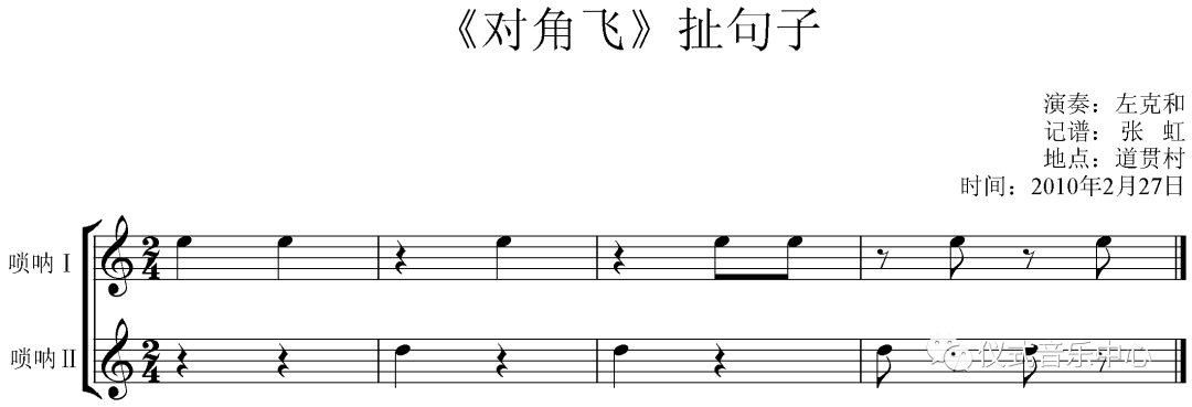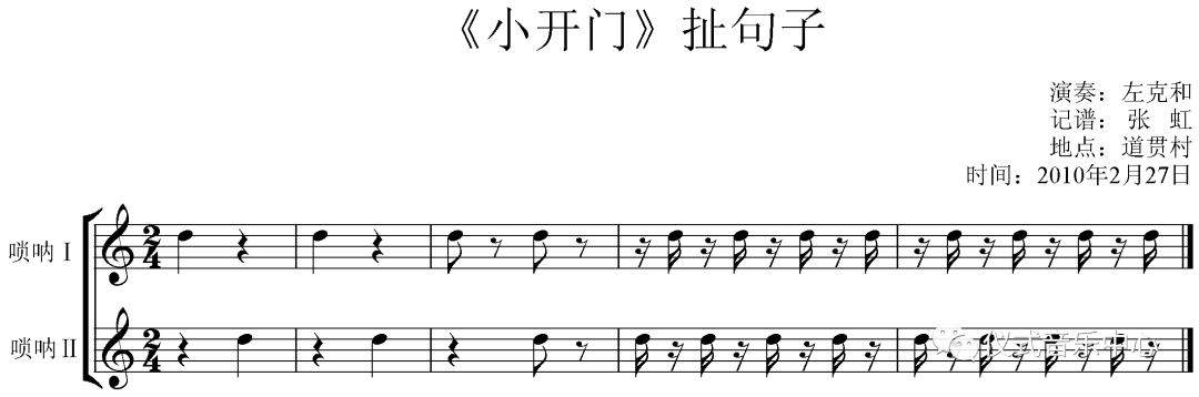 演奏中,两支唢呐将某段或某句对答,使乐曲进入高潮,艺人称为扯句子【《中国民族间器乐曲集成•湖南卷》编辑委员.《中国民族间器乐曲集成•湖南卷》.北京:中国ISBN中心,1996:33】。扯句子一问一答的形式十分活跃,此时的4∕2拍与其他部分的缓慢形成强烈对比。仪式第二天晚上,夜唢呐乐班演奏的长行类子【小开门】、【对角飞】中运用了扯句子的演奏形式: