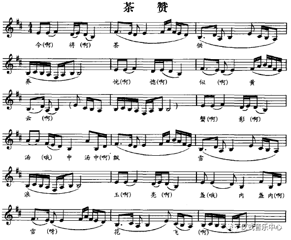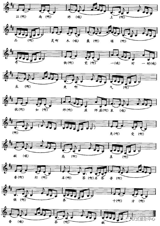 以下是请圣中主法师周诗斌所演唱的【茶赞】,五声调式,以级进为主,并配以大跳和切分,腔长字少,加入了许多衬词: