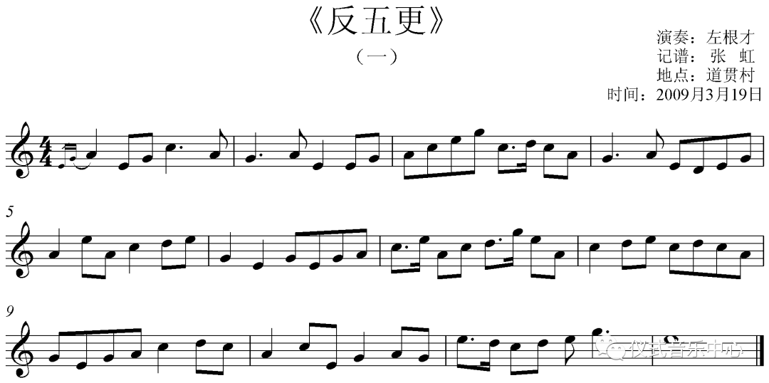 慢路鼓子一般为唢呐齐吹,也可加入其他吹管乐器或拉弦乐器,如笛子、二胡,旋律悠扬华彩,受语言影响较大,为湘中典型音调,以角调式、羽调式居多。慢路鼓子有一部分曲牌为多段体,中间穿插【五槌】【一槌】等锣鼓,除【神调】之外,大部分曲牌以【普通尾子】结束。谱例3为艺人左根才在送祭时演奏的第一首乐曲。