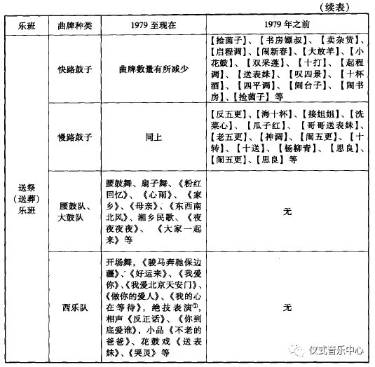 虽然丧礼中加入了不同属性的乐班,但纵观乐班的功能便可知,道场中传统曲牌的传承相对稳定,礼俗文化也保留较为完整。西乐队、大鼓队、腰鼓队只出现在远离核心的送祭和闹丧,决不涉入道场,是专门用以娱乐大众的音乐,并没有打乱人们已有的认知结构。