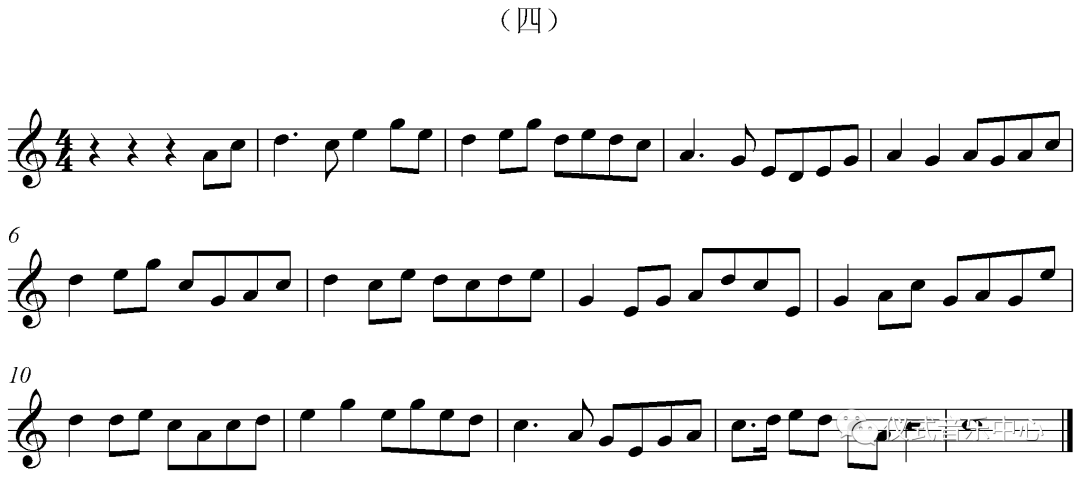 祭奠时常常需要奏大小乐,儒教【详见第二部分人声中的“喊礼”】本身并没有特定音乐,此时的大乐指唢呐所奏民间曲牌,小乐为拉弦乐器所奏乐曲。谱例4为道乐班艺人左露在第一天祭奠时演奏,4/4拍,五声调式,旋律以级进为主。