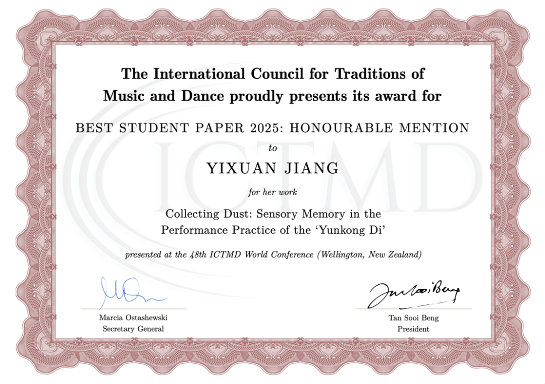 获奖|上海音乐学院硕士研究生蒋艺轩荣获国际音乐与舞蹈传统学会(ICTMD)2025年度学生论文荣誉奖