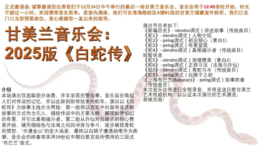 本场演出仅选取部分场景,并非呈现完整故事,旨在唤起人们对传说的记忆,并以此辞别即将结束的蛇年。演出以《白蛇传》为故事主线分为两组:第一组将以宫廷中向皇帝呈述新故事的方式作为引入,描绘传说中的主要人物,展现如梦似幻的奇景,并引出真相揭示者。第二组从许仙对白娘子的倾心赞美开始,继而描绘她与法海之间的冲突与争斗,逐步展现青蛇的愤怒与“水漫金山”的宏大场面,最终以白娘子遭遇劫难作为高潮。音乐会的终章将采用19世纪中期日惹宫廷所惯用的三段式“布巴兰"曲式。