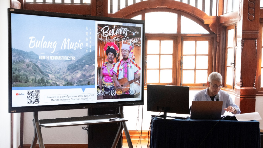 下一场论文研讨由国际影音民族音乐学研究组主席莱昂纳多·达米科以《原生态民歌、神话与舞台展演:以云南布朗音乐的可持续性为例》为题进行发言。