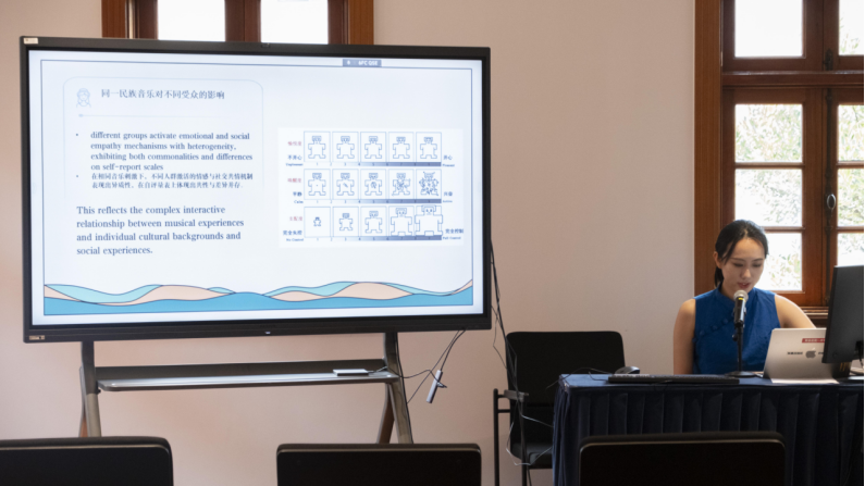 首先由欧阳秋月带来《非遗音乐的艺术疗愈潜力:基于民族影像志的实证研究》。该部分探讨了中国少数民族非遗音乐在当代社会中的疗愈潜能。面对非遗传承挑战与现代社会心理压力,研究团队在滇西多民族社区展开跨学科探索。在方法上,结合了音乐人类学田野调查与创新技术应用:通过深度访谈、高质量影像记录,并首次在田野环境中系统性使用便携式皮肤电传感器及心理量表(如SCL-90),同步采集参与者体验非遗音乐时的生理信号与主观感受。核心发现显示:不同民族音乐对同一人可引发显著差异的身心反应,证明文化语境是关键;同一音乐对不同背景受众的影响亦具个体差异;即使不懂歌词,音乐本身也能有效唤起情绪。基于此,研究提出“文化疗愈机制三维模型”,整合文化、感知、生理三个维度解释作用机制。研究展望了技术赋能下的应用路径:利用AI分析多模态数据建模音乐情感效应,通过VR重建沉浸式音乐仪式场景,发展共创式影像民族志以增强文化感染力。结论指出,结合科技的新一代音乐影像志超越了传统记录,成为“可听、可看、可疗、可共、可持续”的动态平台,为非遗活化、心理健康及社会联结提供了创新实践方向。