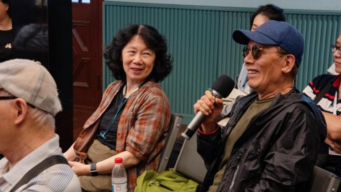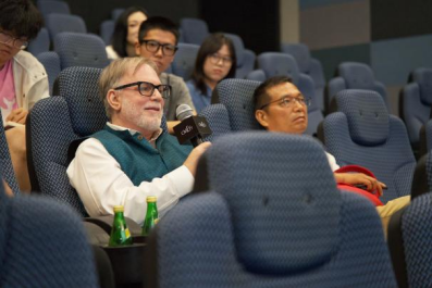 特邀影片《两个诗人与一条河》放映后,主持人程俏俏做了翻译与阐述。现场观众与导演沃尔夫(Richard K.Wolf)就影片拍摄初期是否对受众者已经进行了设定、研究者是否应该在作品中出镜、全真视角和客观呈现的选择、如何理解两位歌者以不同方式演绎的相同爱与离别的主题、结尾音乐选用的目的及深刻含义、片中宗教和世俗两种体裁的区别等问题进行了深入的交流与探讨。