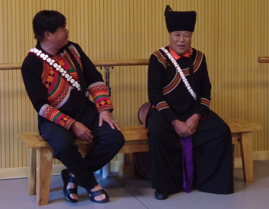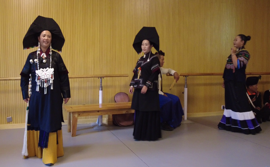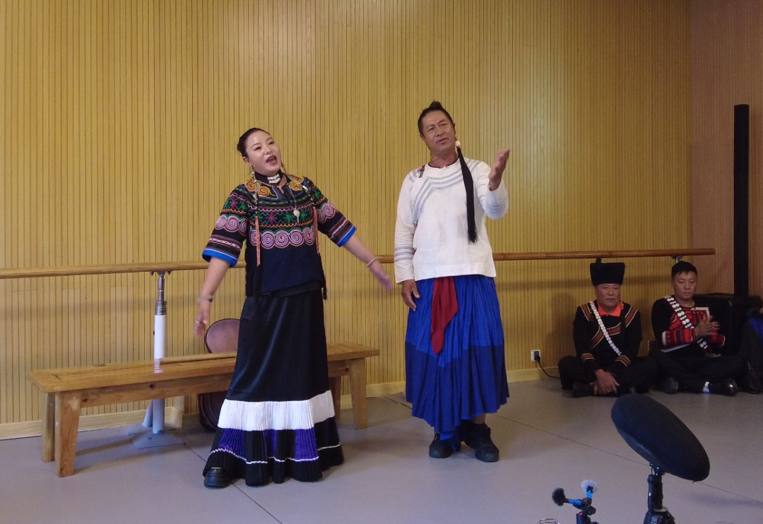 传承人们首先集中进行了表演,让大家为之震撼的是沈尔阿培与吉力么子扎演唱的彝族高腔。二人演唱了火把节时的情歌,他们的歌唱一句紧接着一句,一句还没唱完另一句便已开始,像是“你追我赶”。但在采访过程中阿培老师说:“在现实生活中可能会间隔很久,因为我们要想歌词。”随后另一位高腔唱法传承人吉使日黑为我们带来了一首阿都高腔。在学员们问及“丫”和“合”的关系时,传承人老师们强调“‘丫’和‘合’不能分开。”