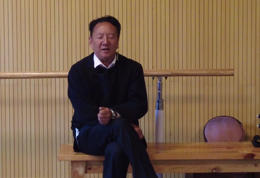 下午2点,第一组成员与泽英俊等四位传承人老师进行了更加深入的交流。泽英俊将上午所演唱的曲调旋律进行了细致的解释说明,例如,然玛《拉舍米》一般在大型的活动庆典上演唱;《罗沙纳玛》在春节时唱,春节过后则会唱一些类似于《打瓦》的薅草劳动歌曲等。传承人们还讲解了演唱要领:“起音要起好,不能过高也不能过低,气息需要循环,由小到大再由大到小,要像波浪一样……”最后,传承人老师们唱起欢送的歌,第一天的考察结束了。