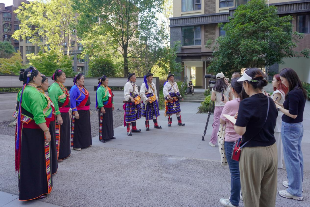 上午9点,小组成员在都江堰市竹径悦山小区门见到了泽英俊老师及其多声部演唱团队。团队一行共9人,3男6女,在泽英俊老带领下向小组成员展示了阿尔麦藏族多声部民歌中极具特色的“日代”和“尔布善”唱法,并演唱了包括然玛曲调中的《拉舍米》在内的10多首曲调。在聆听中,成员们逐步深化了对阿尔麦藏族多声部民歌独特声部构成与艺术魅力的感知。