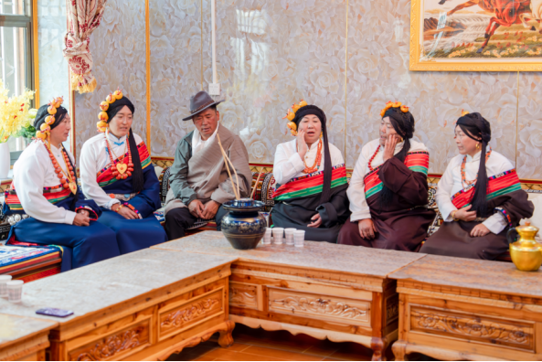 热情的藏族民间歌手邀请每一位学员前去酒坛旁,品尝他们独特制作的青稞酒,若有人饮酒过慢或扭扭捏捏,两位歌手站在两侧,以“扯耳朵”的动作来劝酒。此时的客厅,热务沟藏族同胞的歌声和学员们的声音夹杂在一起,倍感亲切。让大家不禁感叹,这才是热情的藏族人民,这才是田野该有的场景。小酌之后的学员们,脸上洋溢着对藏族同胞的喜爱和不同文化氛围所带来的幸福感,依依不舍地离开民间艺人家,去往藏族多声部民歌传承人阿旺老师家,准备下午的田野工作。