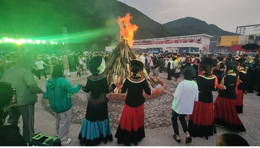 傍晚将至,学员们临时接到通知:几位传承人将赶赴美姑县洒库乡。于是匆匆随行,尚不知一场“火的盛宴”正悄然候场。前几日的火把节早已在多数彝区落幕,而美姑县的日诺方言区却自古本没有过火把节的传统习俗,但今日恰逢当地以非遗主题的自驾营地的开营仪式,主办方特意安排了毕摩祈福点火仪式、火把狂欢歌舞以及彝族口弦、克智表演等极具民族特色的活动。