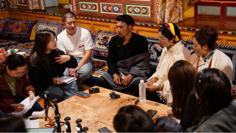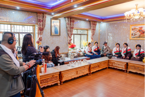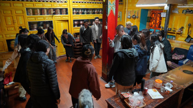 喝“砸酒”互动环节结束后,阿旺一家人分别为大家演唱了《的硕》和《拉依》。最后在一首欢乐的锅庄舞中结束了采录环节,学员开始对阿旺一家进行细致的访谈。