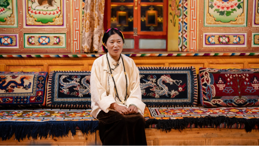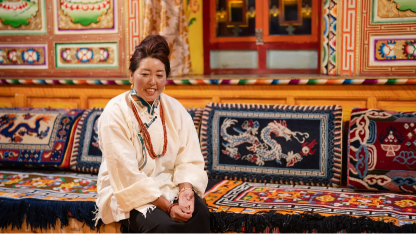 30日上午,研修营第一组跟随热务沟藏族民间艺人达梅老师,与另外4名艺人汇合,开启了热务沟藏族多声部民歌的采录工作。“开坛仪式”可谓是热务沟藏族人在众多节日节庆中不可缺少的开场仪式。伴随着一位男性艺人开启开坛仪式,五位女性艺人唱起酒歌《偶作作》加入仪式中,在充满藏族元素装饰的客厅里回荡起热务沟藏族人最动听的歌声。