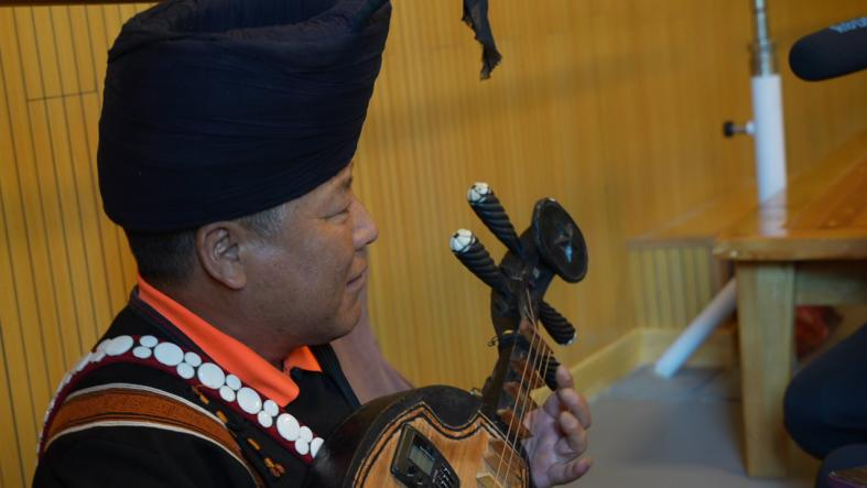 这是田野考察的最后一天,也是研修营学习的最后一天,我们与民间艺人约定在宾馆进行访谈录制。访谈从前一天晚上祭火的两位毕摩的吟诵中开始,他们还原了祭火仪式中的一部分,让我们近距离地再次感受了神圣的仪式。紧接着,毕摩与还在读小学的“克智少年”都为我们展示了克智,他们以丰富的词汇量、日复一日的积累进行了此次“表演”,令我们惊叹不止。
