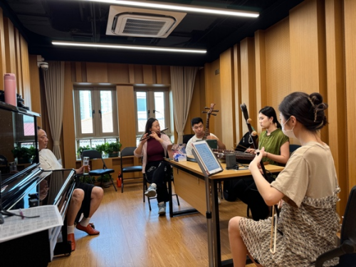 这些现实冲突促使她在项目进入第二年后开始主动调整策略:一方面,项目组试图定期开展传统音乐社群形式的“雅集”,恢复更贴近丝竹文化语境的交流空间;另一方面,本项目还获得了上海音乐学院民乐系、音乐学系专业教师的支持,借由此契机成立了上音“乐龠”组合,作为教、演、研一体的实验平台。乐龠组合不仅汇聚了对老乐器有兴趣的学生群体,还引入民间丝竹社的资深演奏者,采用“老带青”的方式,将传统技艺通过口传心授的方式传递给年轻一代。这种教学与实践相结合的方式,力图逐步建立起一个更具生命力的江南丝竹传承体系。