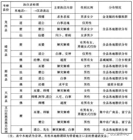 由于地方性的差异,壮族民间执仪者称谓繁多,错综交叠,各类执仪者尽管有着相对明确的分工,但他们相互之间又有着密不可分的关系。在民间,不同类别的执仪者之间尽管很少交流走动,但在执仪者间仍有一些对各自能力及分工的相互评价。