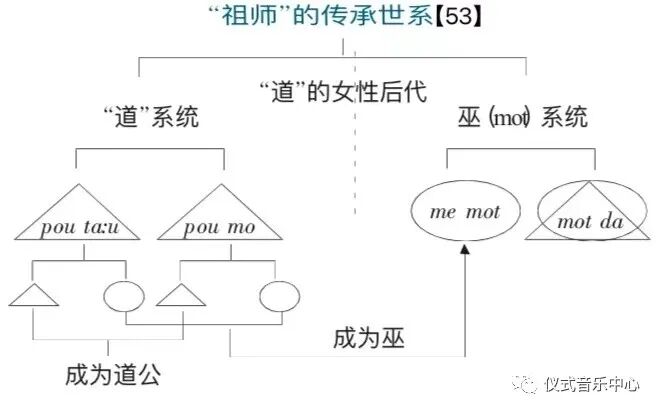 笔者曾经在田野考察中特别关注了靖西壮族民间信仰中的巫(mot)、道关系。从执仪者性别来看,其巫的社会性别皆为“女性”,即便有男巫(mot da),其在执仪中的着装亦与女性执仪者无异,而其道公却又仅为男性。在当地的信仰系统中,这两类执仪者都有祖师家系,亦一定会有继承者。但在道公的系统中,从未有女性的记录。也就是说,一个祖上有道公的家系,如果继承者的命运降临在女性身上,她也不会去做道公,只能做魔婆。其传承如图所示。