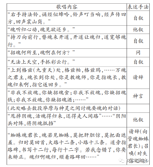 许多“坐巫”型巫乐中类似“独脚戏”来做呼应问答形式的代言体,不仅为歌路的核心叙事技巧,也广泛应用于其他类型的执仪活动中。比如彝族的毕摩针对受惊后的精神恍惚或生病者,以及在参加葬礼后和过年过节等场合所行的招魂仪式,就以《招魂歌》建构了一条歌路。(见表)