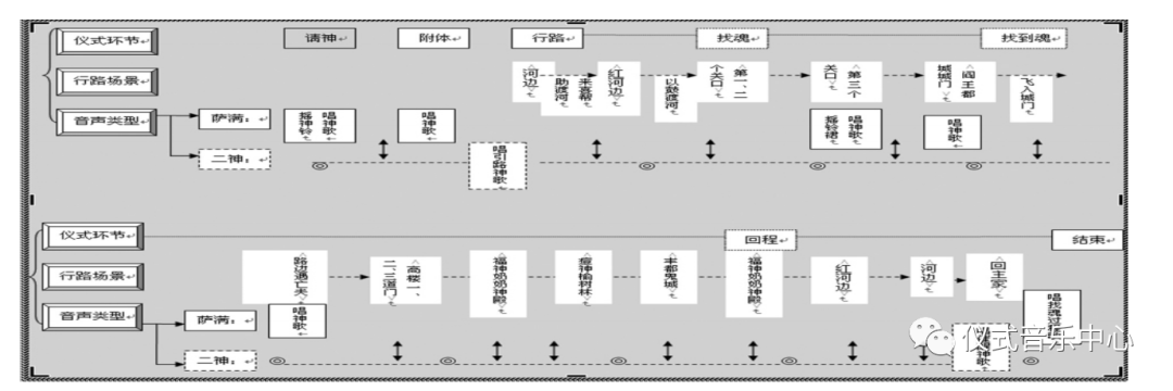 无论如何,仪式中各种不同的关系离不开“呼应”这一链接方式。而“呼应”亦是人类社会最为基本的交往方式之一。它不仅成为以歌行路的展演核心,也延伸为一种结构乐思的根本方式。尽管其发生学意义上的【神/魂/鬼]-巫-人之关系已逐渐褪色。