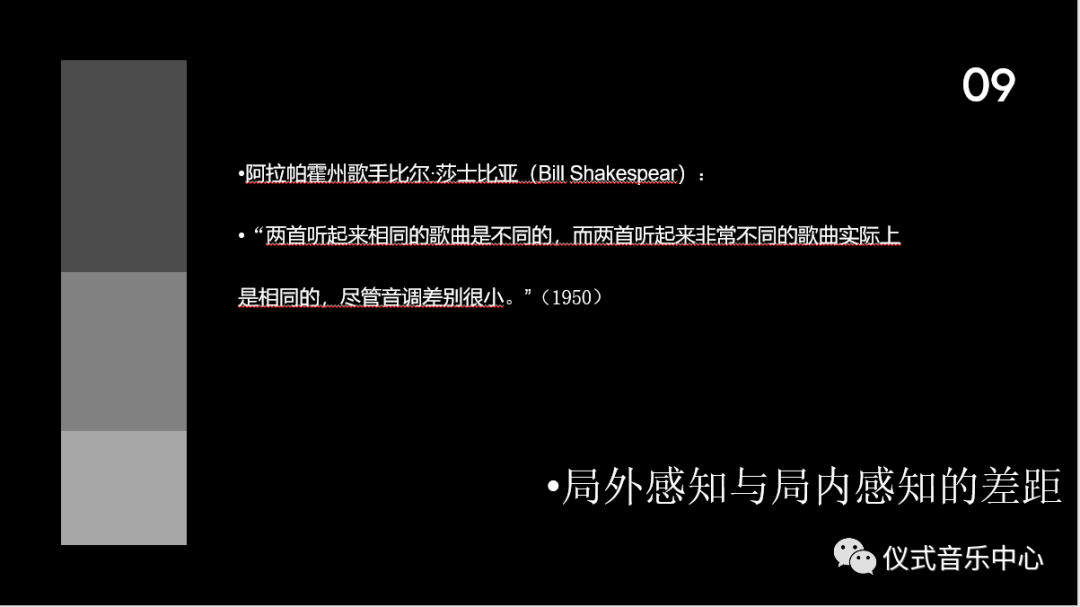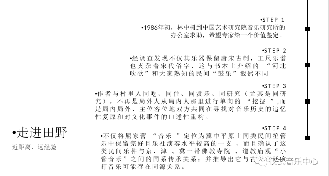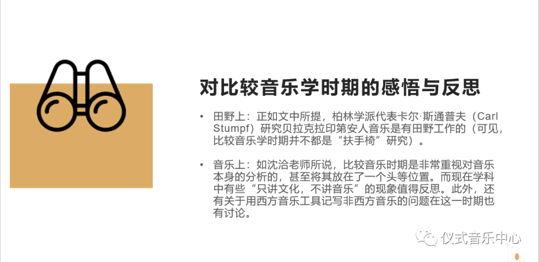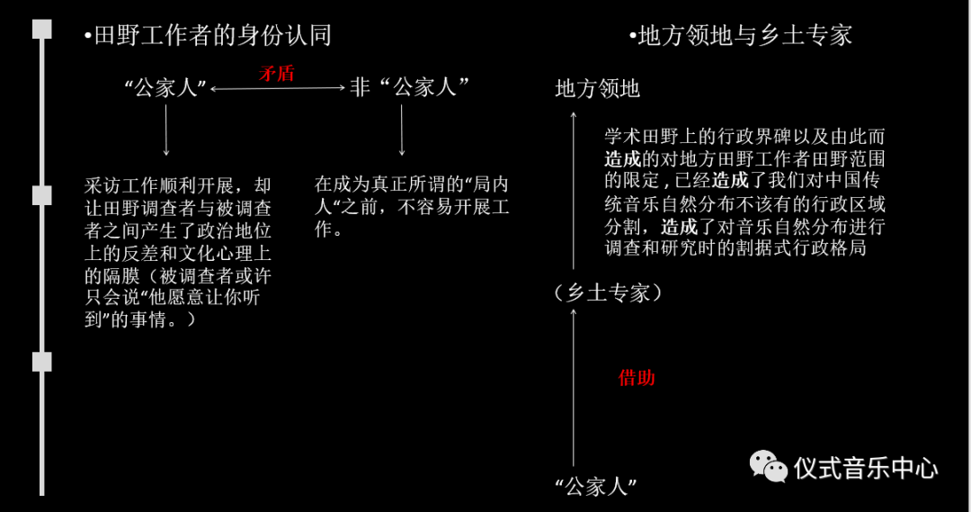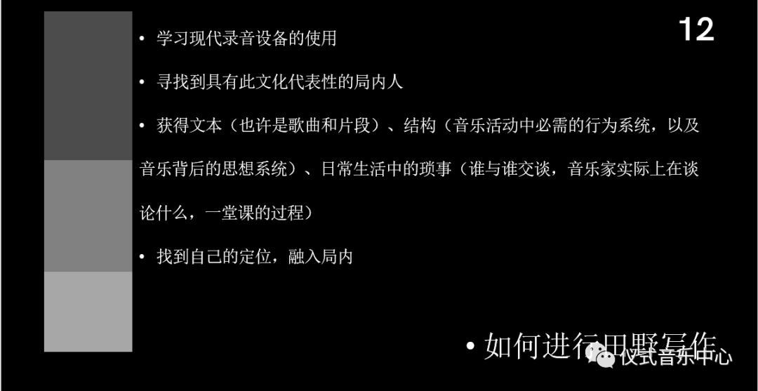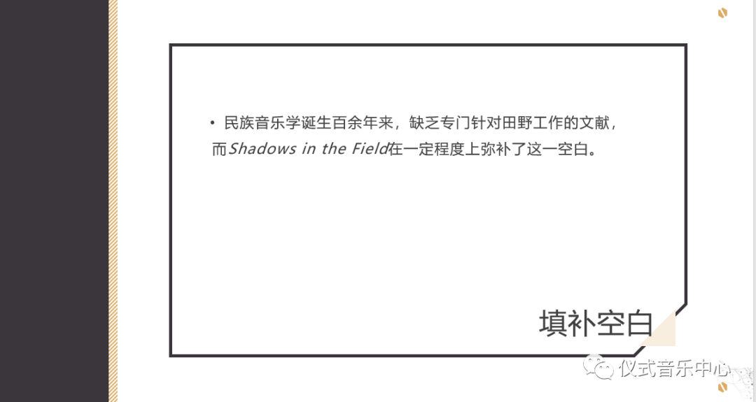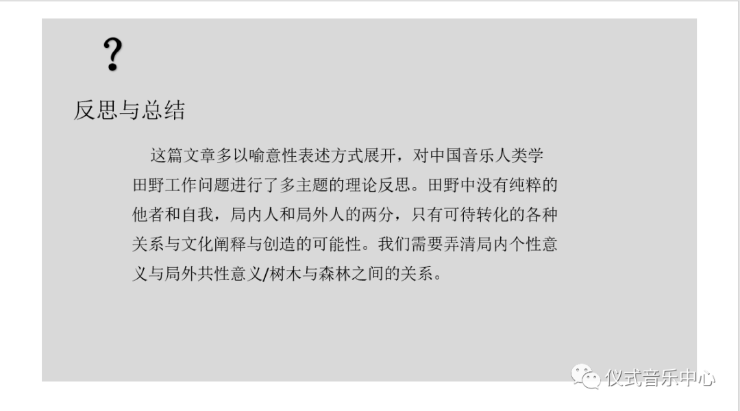 但在这个作者自认为成功的田野工作中,作者也反问自己能不能达到音乐人类学所要求的学术规范?当然,作者对这个问题的回答是否定的,他认为即使是有了住居体验和完全参与,也未必能真正融入该文化之中。所以我们在PPT中将标题写成“反思——永远的局外人”。