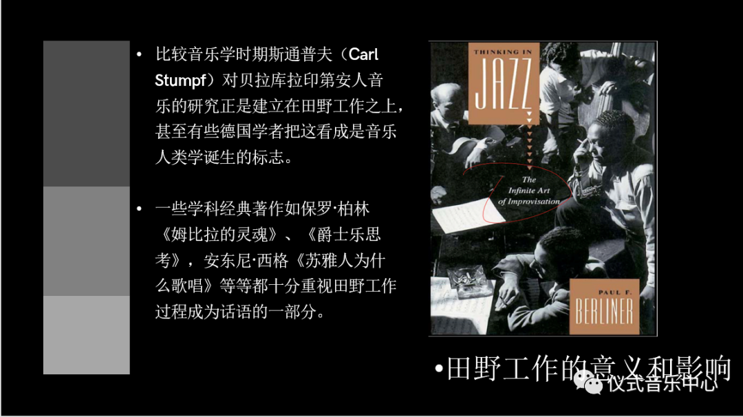 在Shadows in the Field 这本著作出现之前,较少有对现场工作中的细节问题进行详细描述的著作,但田野工作往往又处于音乐人类学学科的中心地位。