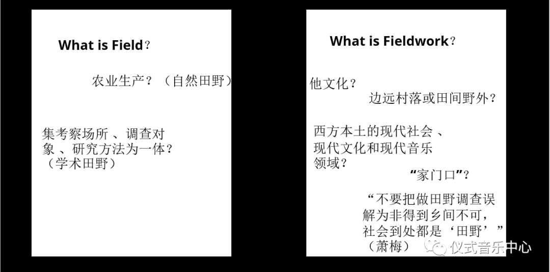 该文一直围绕着“田野”这两个字。首先,作者提到田野最原本的含义就是田地旷野、乡间野外(自然的田野),但由于西方人类学 、民俗学过去主要研究原始部落或农业社会的传统文化 , 因而“田野”逐渐成为社会人文学科的一个核心概念。音乐人类学中的田野则指一种音乐文化现象发生的实际环境和场合。