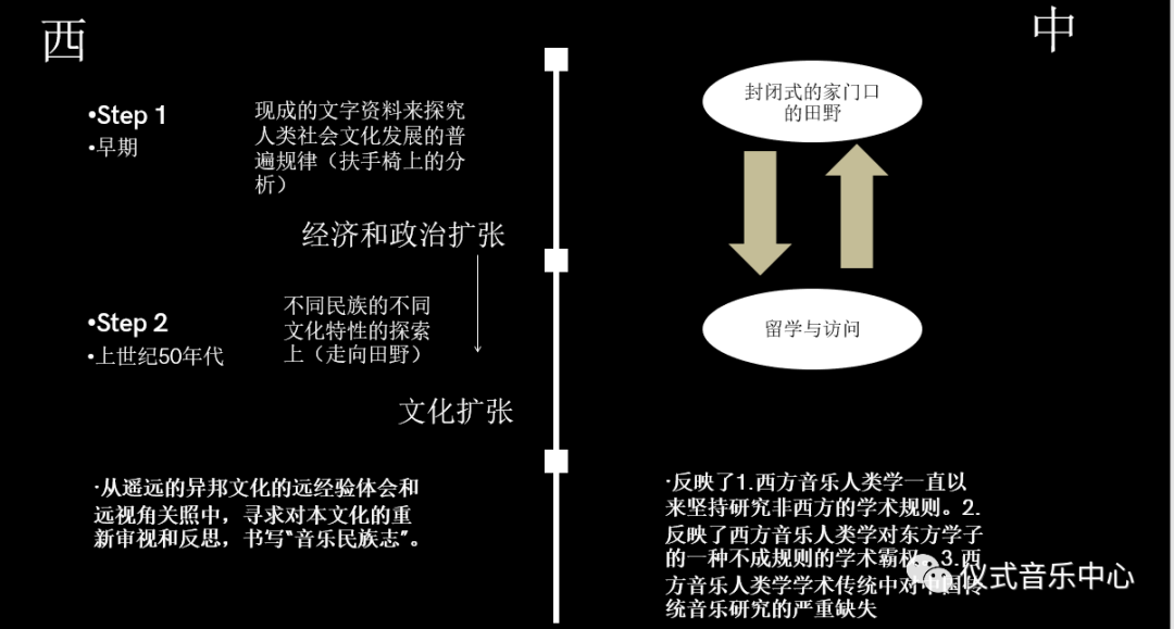回看西方的音乐人类学发展,可以发现他们是想从遥远的异邦文化的远经验体会和远视角关照中,寻求对本文化的重新审视和反思。而中国的音乐人类学则更偏向于在“家门口”做田野 。这反映了:1.西方的音乐人类学一直以来坚持研究非西方的学术规则。2.西方的音乐人类学对东方学子的一种不成规则的学术霸权。3.西方的音乐人类学对中国传统音乐研究的严重缺失。